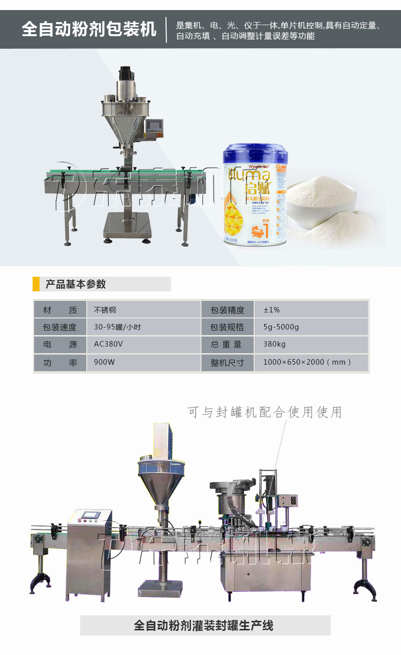 ①全自動奶粉灌裝機 外表除電機外其余均為不銹鋼制成;組合式透明料箱,無需工具即可方便拆洗。
