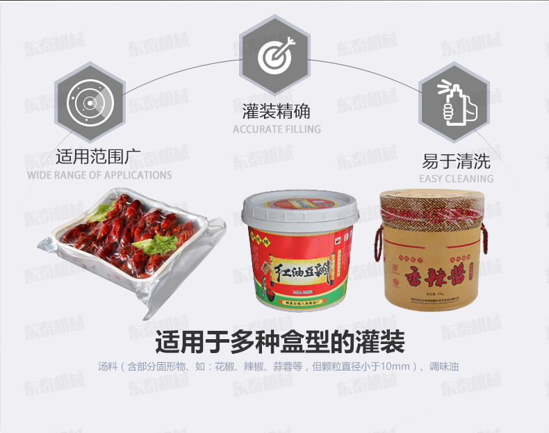紅油辣椒醬自動灌裝機針對于調味小龍蝦深加工行業的調味油、湯料的加注,整個系統為直線式傳送結構,湯料、調味油可在同一臺設備上實現準確定量,且湯料、調味油為獨立的灌裝系統,互不沖突,具有灌裝范圍廣、速度快、維護簡單等特點,該系統可大大減少生產環節中的浪費,同時也提高了生產效率,為企業節約生產成本。