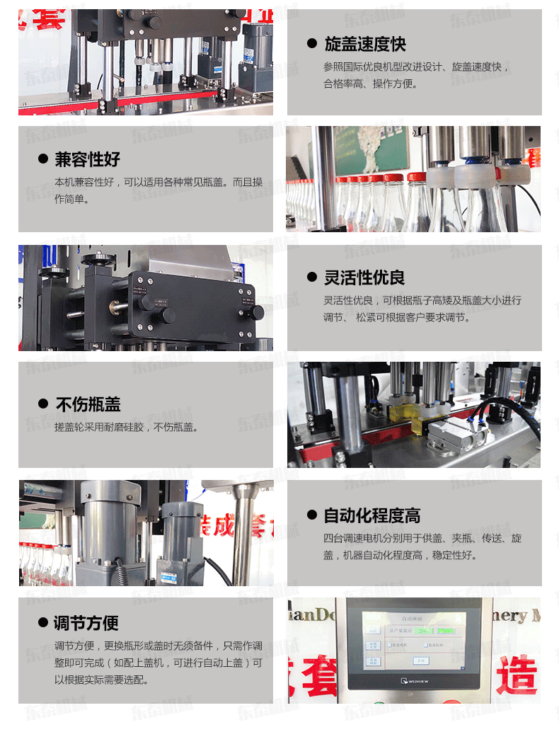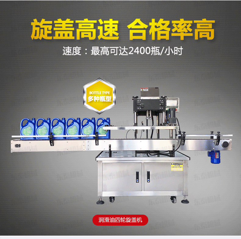 自動(dòng)旋蓋機(jī)原理:電氣控制運(yùn)動(dòng),穩(wěn)定性強(qiáng);設(shè)有定位裝置,旋蓋標(biāo)準(zhǔn),操作方便;鎖蓋范圍寬,可鎖不同形狀規(guī)格的瓶蓋;解決了噴頭、泵頭、噴霧泵、手扣式噴頭旋蓋難的問(wèn)題;鎖蓋轉(zhuǎn)速可調(diào),可根據(jù)不同瓶蓋調(diào)節(jié)松緊度。
