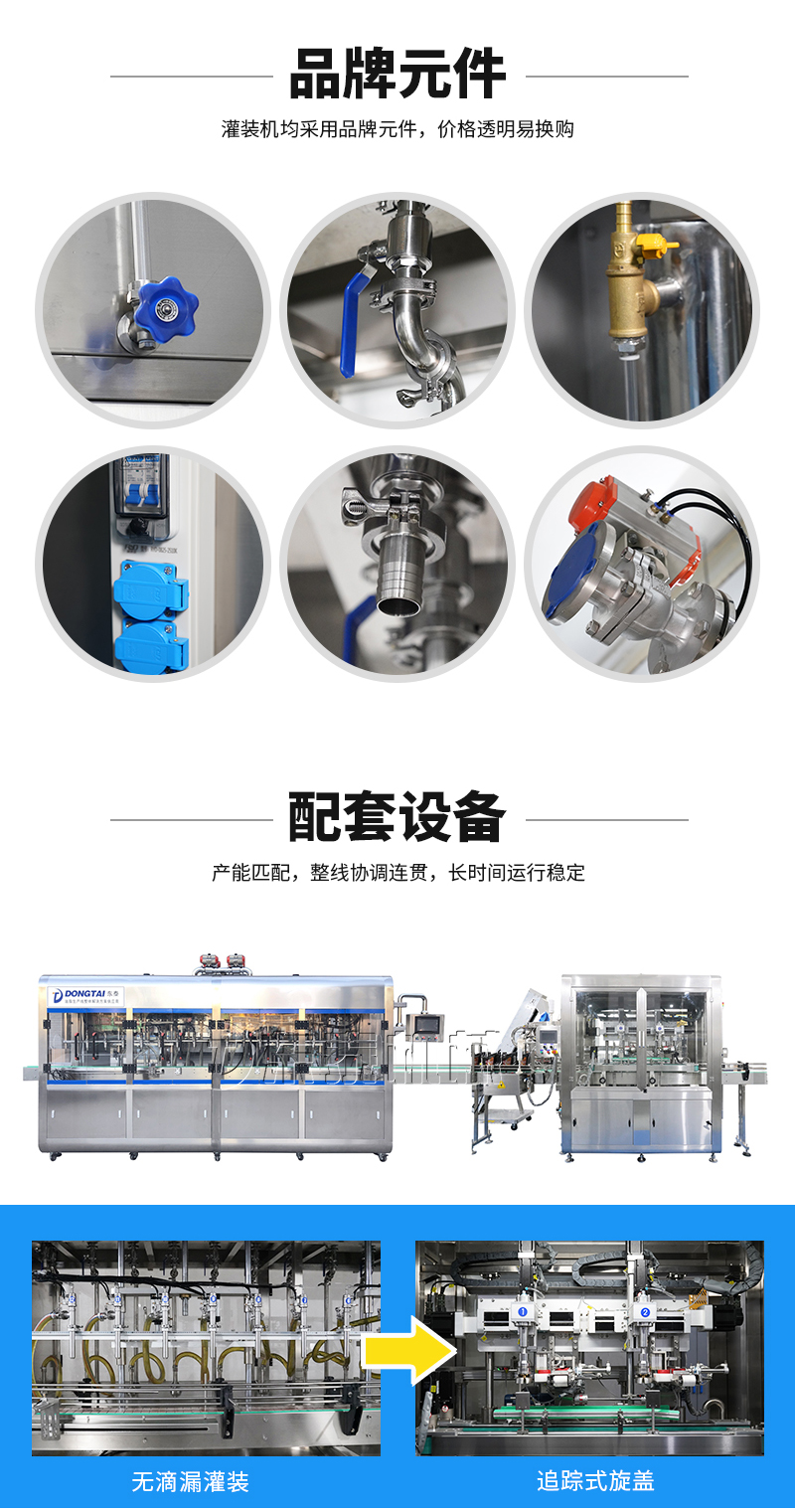 該設備主要針對油脂包裝開發的專用灌裝設備。采用東泰公司的專用灌裝系統:單頭單泵單變頻技術。該灌裝機具有灌裝速度快,精度高,無滴漏的特點。特別適合中高產能的油脂包裝企業使用。